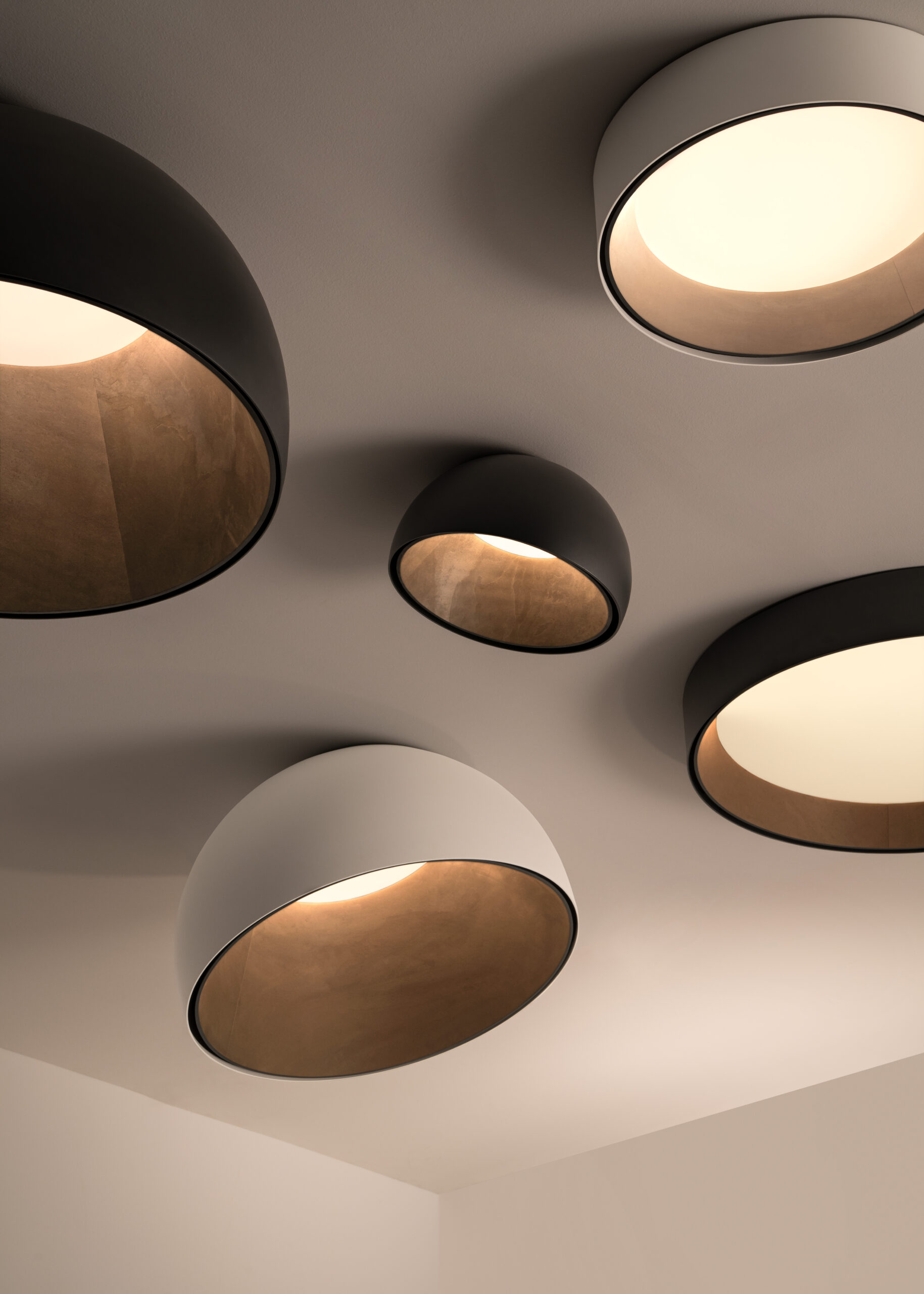 Duo Petra hat Materialkontraste mit Spitzentechnologie erforscht. Die Kollektion kombiniert eine matt lackierte Aluminiumschale mit einem dunklen, mit Schiefer ausgekleideten Inneren, wobei das sanfte Downlight durch das seidig weiche Furnier für eine beruhigende und intime Atmosphäre sorgt.