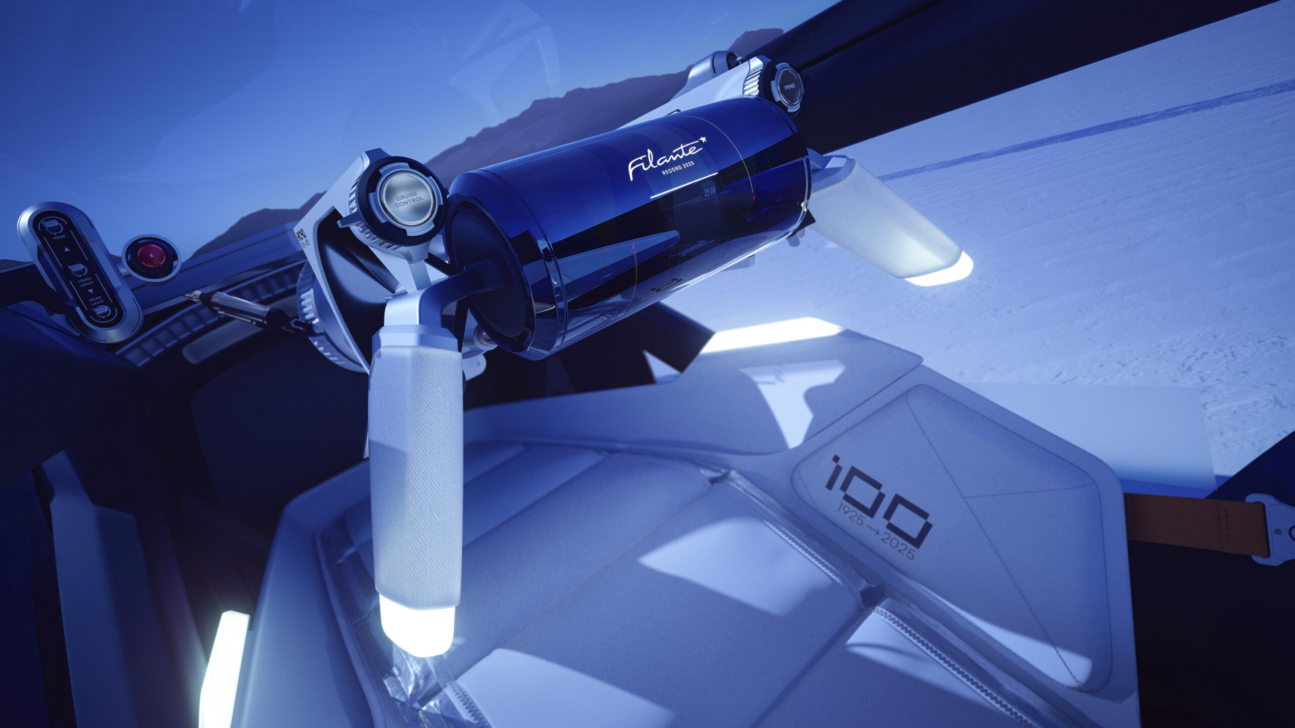Das Innendesign des Filante Rekord 2025 folgt dem gleichen Ansatz wie das Exterieur: Das auf das Wesentliche reduzierte Cockpit ist von der Luft- und Raumfahrt inspiriert und in jedem Detail auf bestmögliche Ergonomie sowie maximale Leistung, Komfort und Effizienz ausgelegt. Jede Komponente (Sicherheits- und Öffnungsfunktionen, Tempomat, Gaspedal, Bremsen usw.) ist leicht zu erreichen. Auch das Thema Gewichtsreduzierung spielte eine wesentliche Rolle.