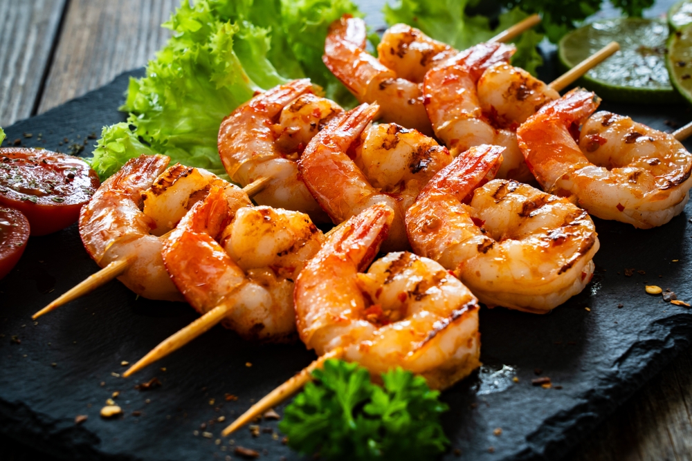 Garnelen (roh, geschält) in Marinade aus Limettensaft, Chili, Knoblauch, Olivenöl und Koriander einlegen. Auf Holzspiesse stecken, kurz grillieren – nicht zu lange, damit sie saftig bleiben. Dazu passt ein frischer Joghurt‑Dip mit Minze.