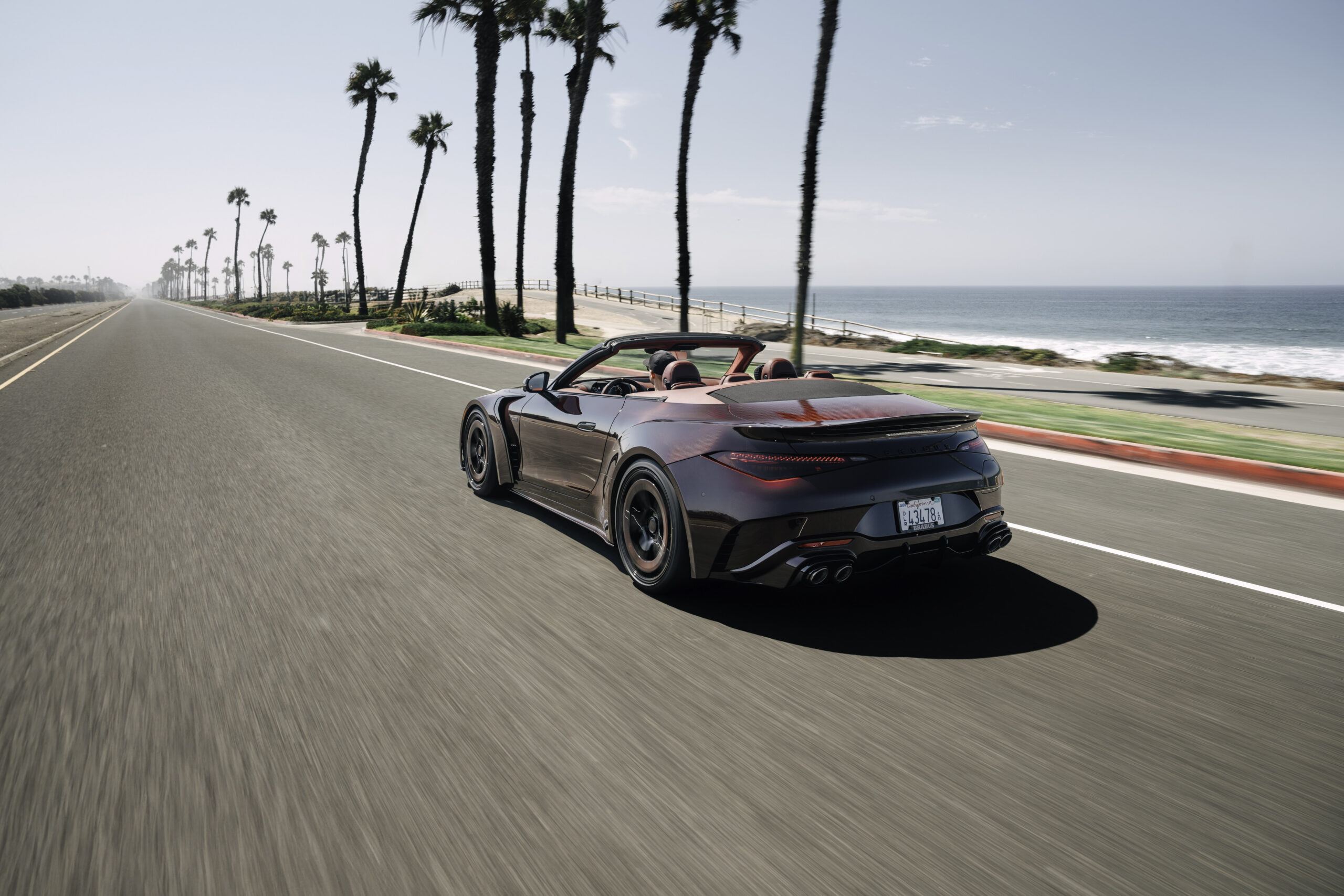 BRABUS präsentiert in Kalifornien das neue Hyper Gran Turismo Cabriolet mit rotem Sicht‑Carbon und Hybridantrieb.