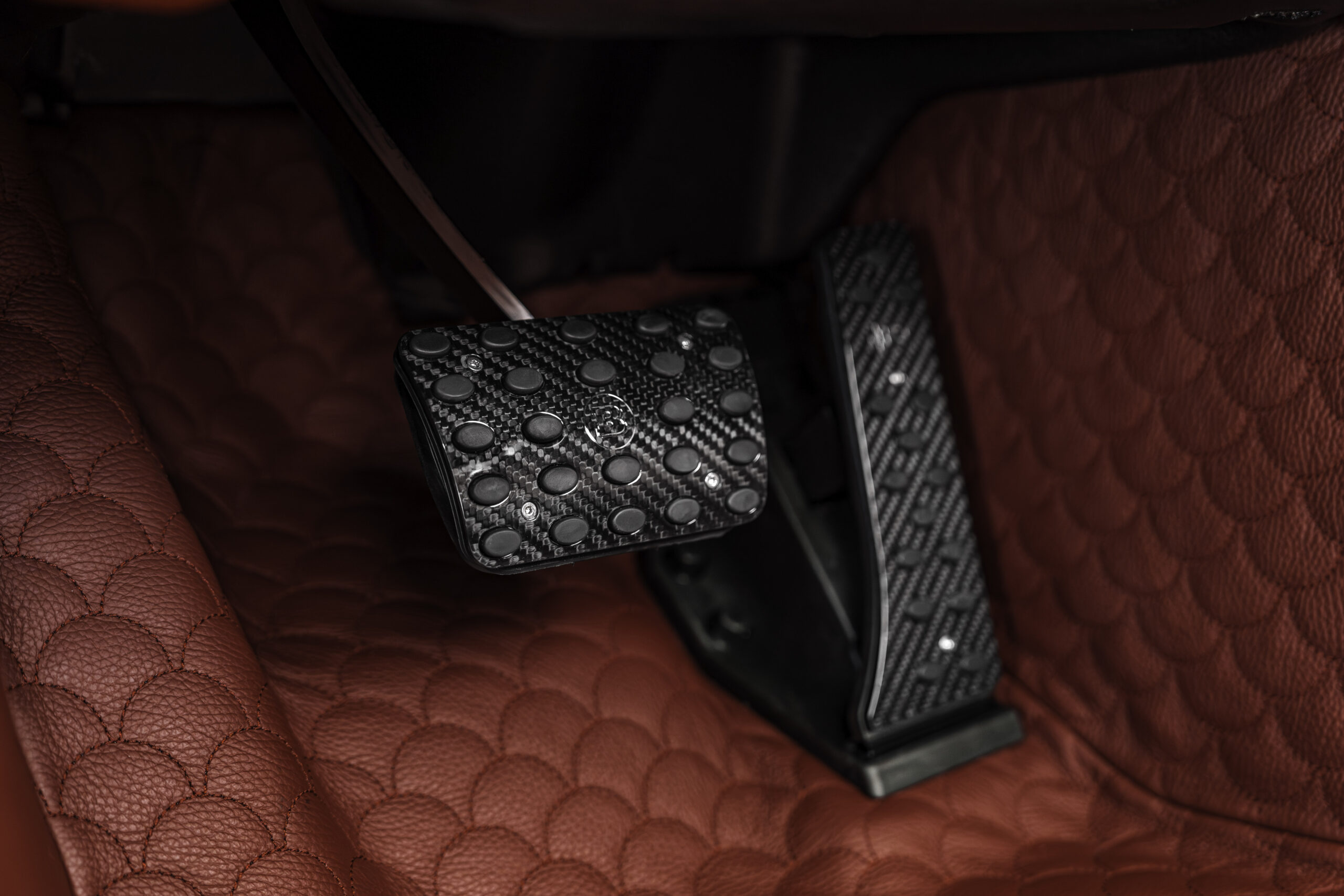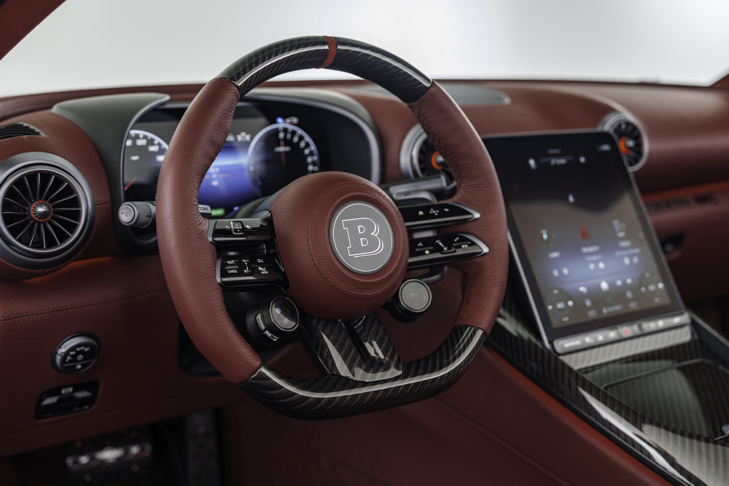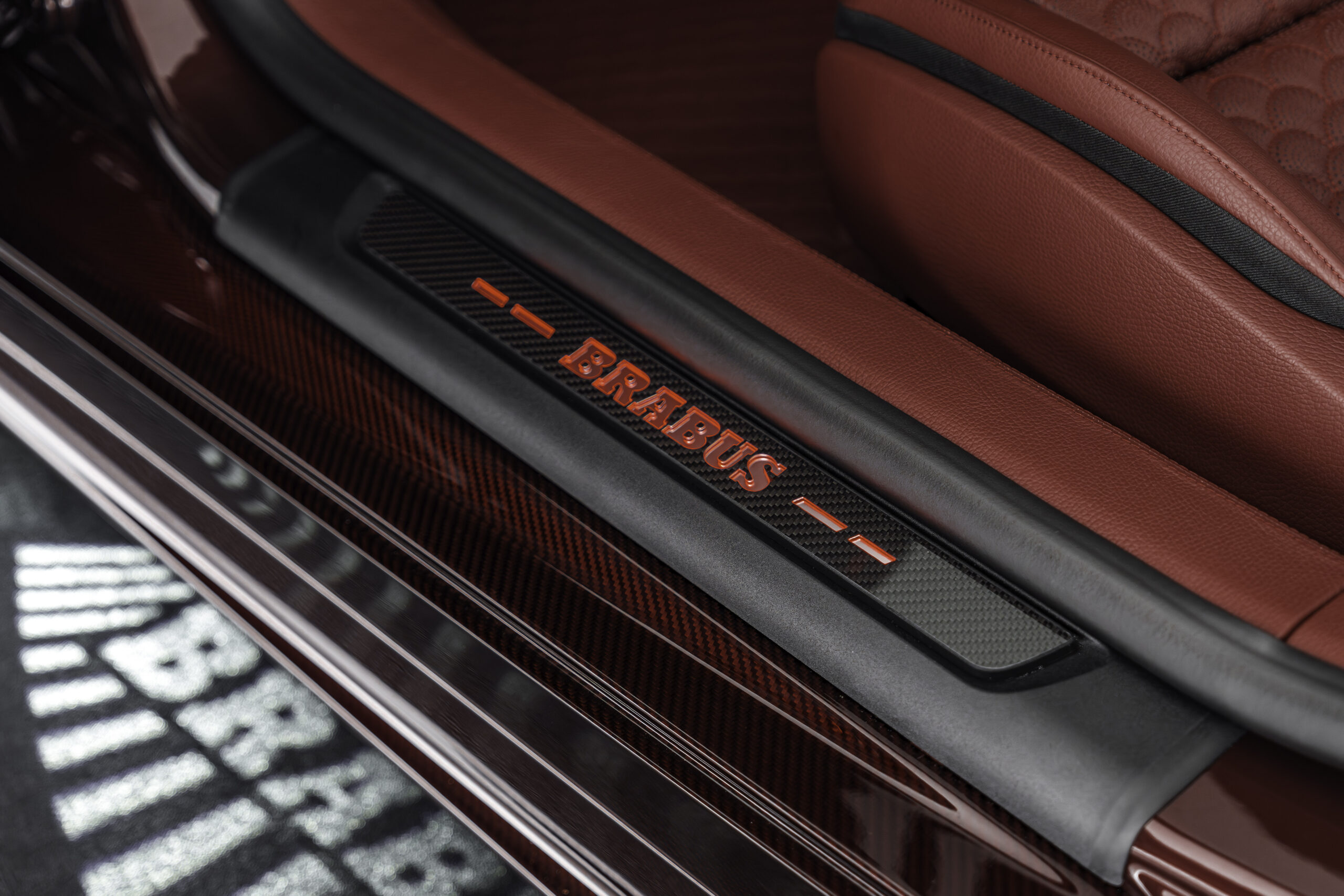 Als sportliche Kontraste zum edlen Masterpiece Leder wurde im Innenraum eine Auswahl von BRABUS Signature Carbon Elementen platziert. Aus dem gleichen Hightech‑Material wurden auch die Pedalauflagen, Teile des Lenkradkranzes und die Einstiegsleisten mit beleuchtetem BRABUS Logo angefertigt.