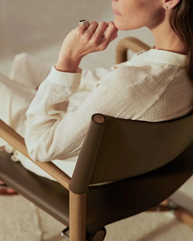 Riegers Stil – eine sanfte, einhüllende Bildsprache – vermittelt eine subtile Erzählung stiller Eleganz: aufmerksam, kultiviert und sorgfältig inszeniert. Wie der Slogan „Nur scheinbar leise“ andeutet, steckt hinter den geschwungenen Formen und der geordneten Ästhetik des Sofas langjährige Handwerkskunst, strukturelle Innovation und technisches Know-how.