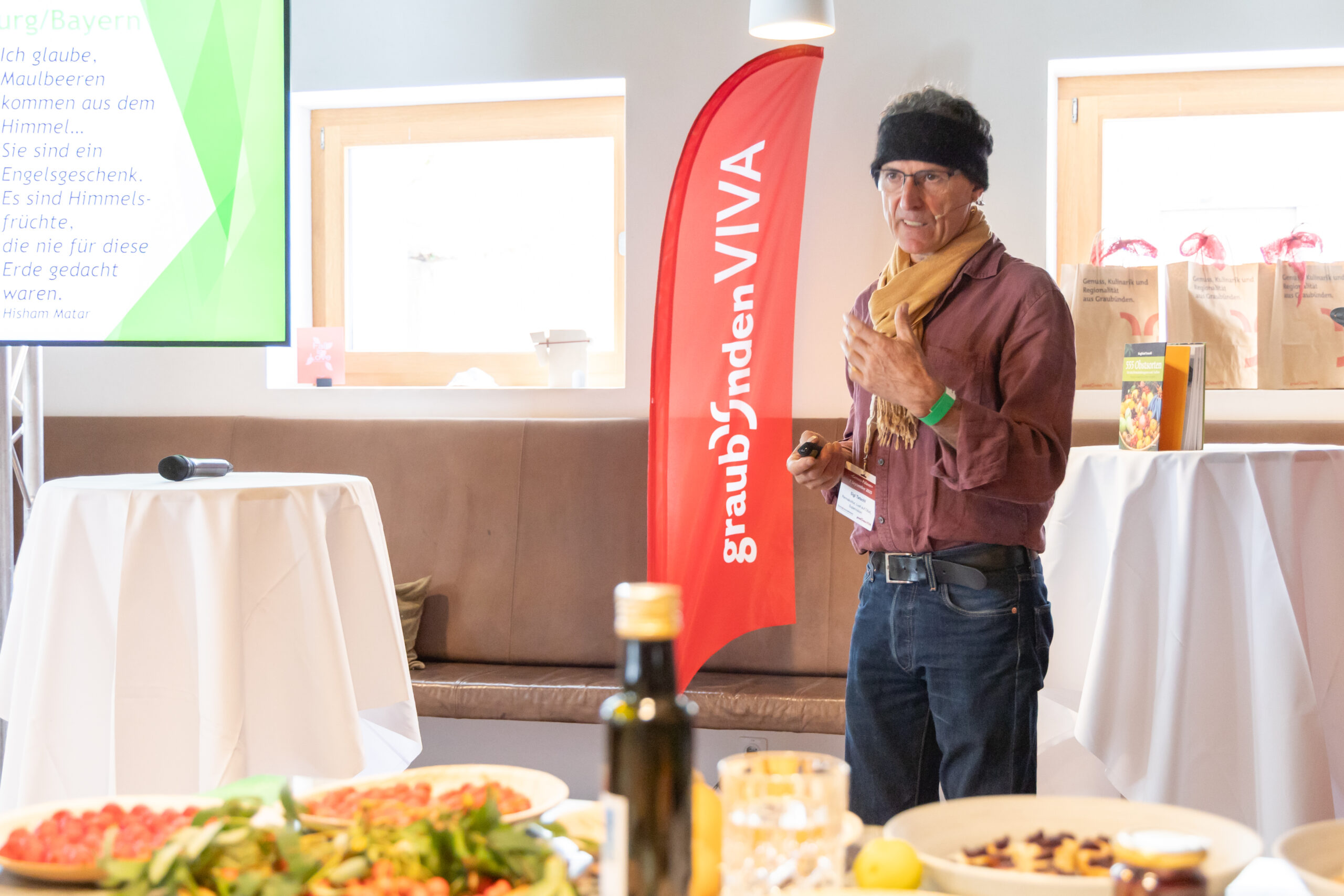 Fachliche Impulse setzten anschliessend die zwei Referate. Der Vortrag von Sigi Tatschl mit dem Titel „Neue Regionalität in wärmeren Zeiten – Chancen für seltene Obstsorten“ war sehr beeindruckend und dies insbesondere deshalb, da das Publikum während seines Referates seine wohl eher unbekannten Obst- und Beerensorten live degustieren konnte.