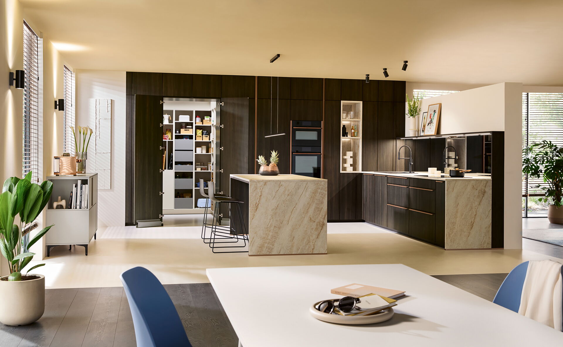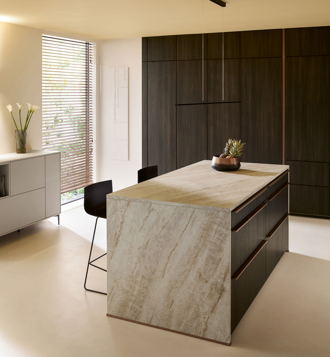Arbeitsplatten, Rückwände und selbst ganze Kücheninseln in Naturstein-Optik verleihen dem Raum eine zeitlose Eleganz.