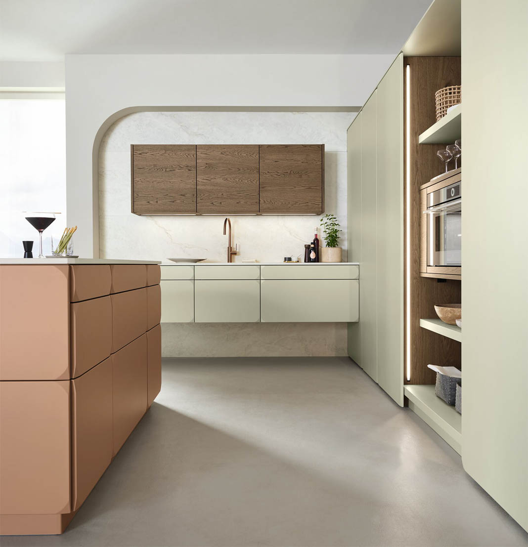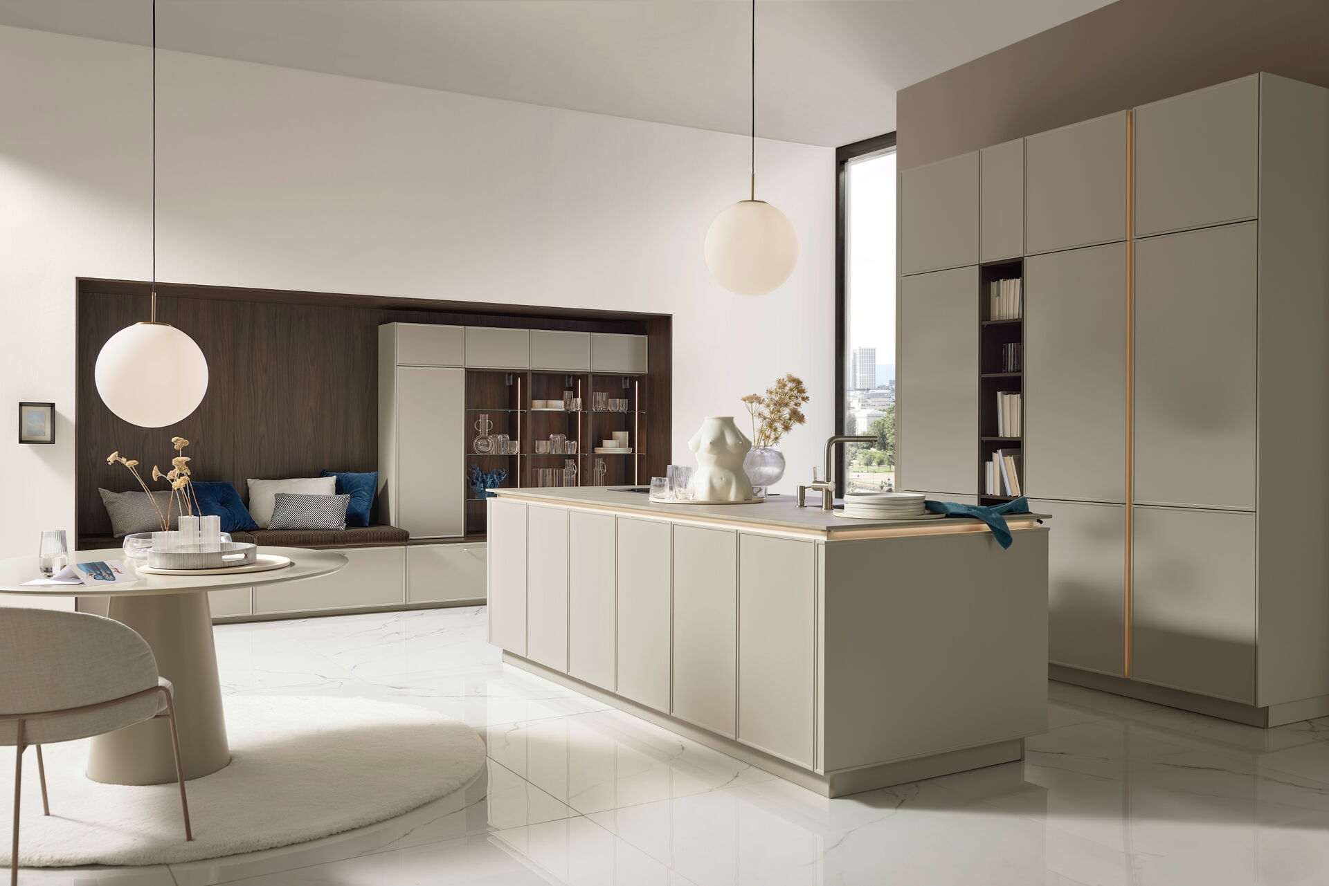 Beruhigte Oberflächen, warme Naturtöne und sanft gerundete Formen verbinden sich mit praxisnahen Neuerungen – von widerstandsfähigen Matt-Fronten über matte Glaskeramik bei Kochfeldern bis zu modular gedachten Wasserplätzen.