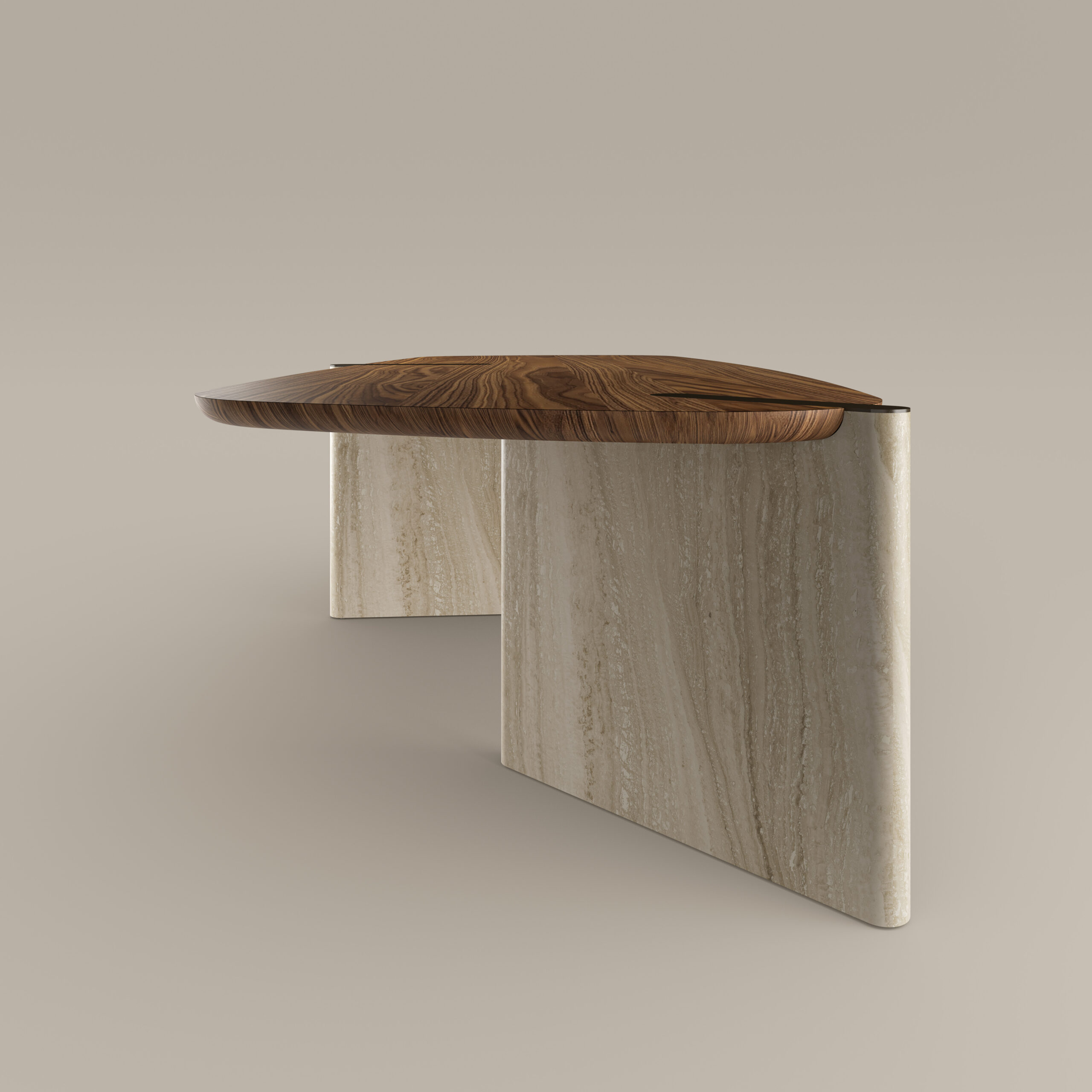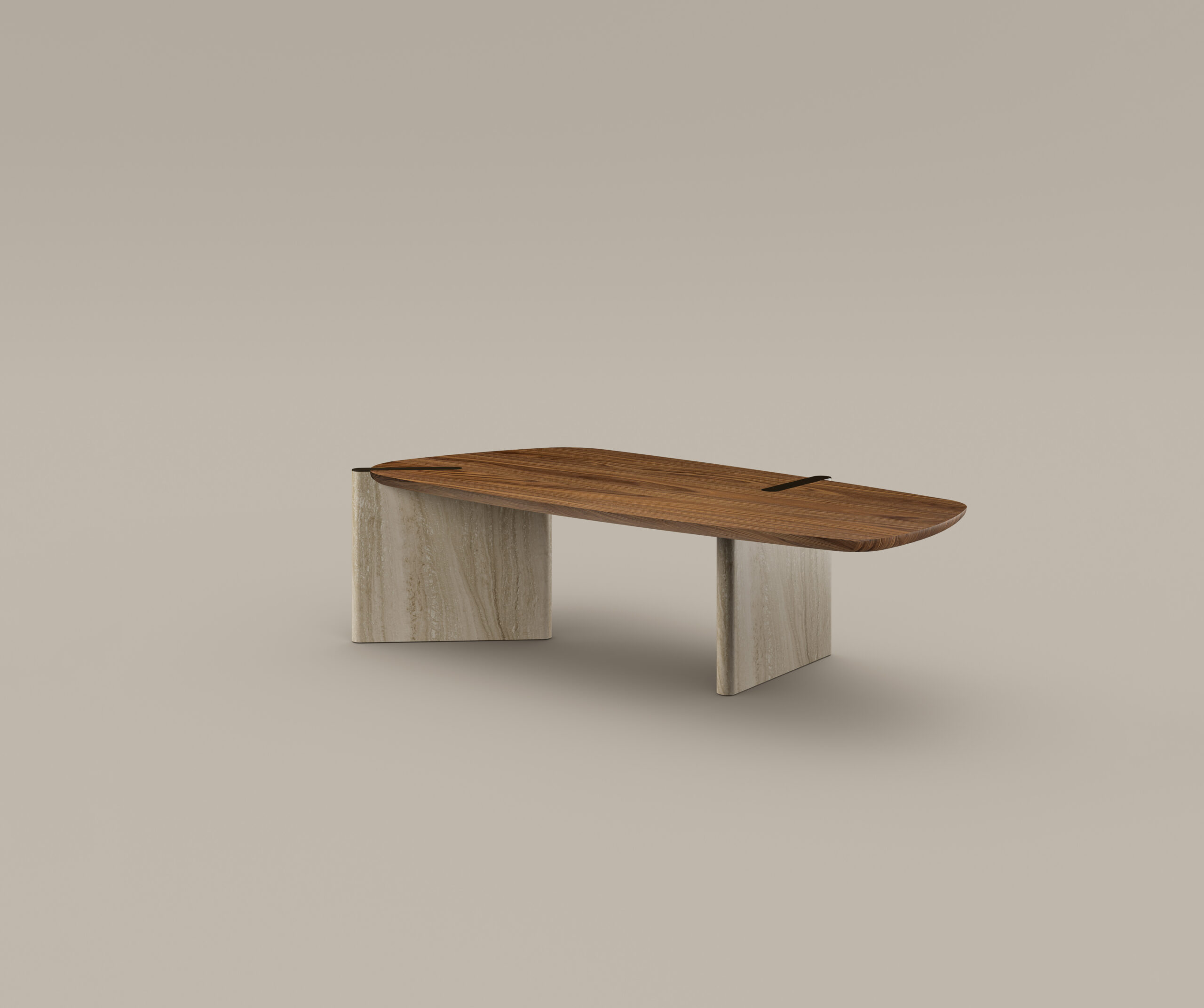 Die Idee eines ungewöhnlichen Gleichgewichts prägt das Design des Tisches. Die asymmetrische Basis mit klarer architektonischer Linie strukturiert den Raum, ohne ihn zu dominieren. Die leicht trapezförmige Tischplatte mit sanft gerundeten Kanten mildert die Geometrie und ermöglicht eine natürliche Einbindung in hochwertige Wohnräume.